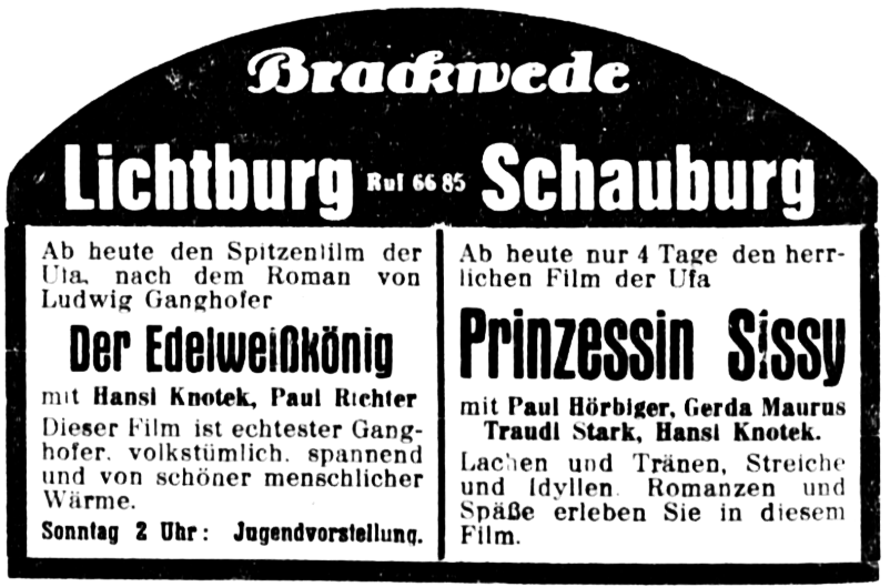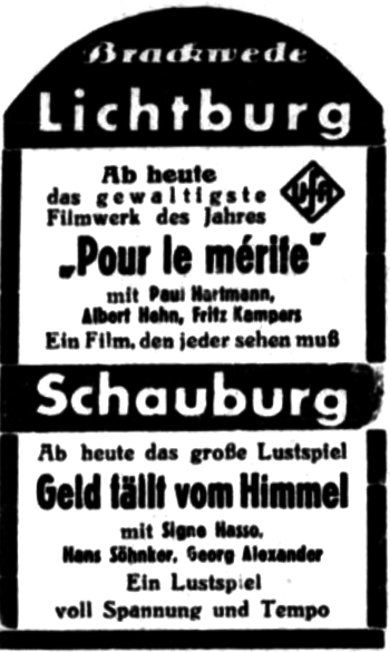 Das erste Brackweder Kino "Lichtburg" ereilte sein Schicksal am Samstag, den 3. März 1945, als alliierte Bomber einen Volltreffer auf den Kinosaal erzielten. Die Saaldecke stürzte ein, es wurde niemand verletzt. Der Vorführraum hatte den Angriff überstanden, sodaß die ERNEMANN II-Maschinen geborgen und im späteren Verlauf im Saal der Gaststätte "Tölke" wieder eingesetzt werden konnten.