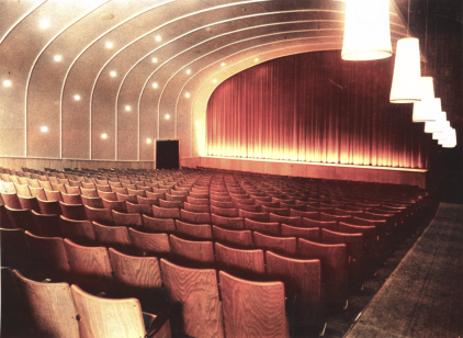 Der Innenraum mutet noch wärmer an als dessen bewußt in ländlichem Stil gehaltener Säulensaal. Von eigenartiger Schönheit ist seine unsymetrische Form. Während die mit Azella bespannte, freundlich getönte rechte Seitenwand rechtwinklig mit der aus Akustikplatten getäfelten Decke abschließt, rundet sich diese in sanfter Wölkung zur linken Seitenwand ab. Das Theater weist ein angenehmes Gefälle auf. die auf Lücke angeordneten 480 Sitzplätze tragen türkisblaue Hochpolster.