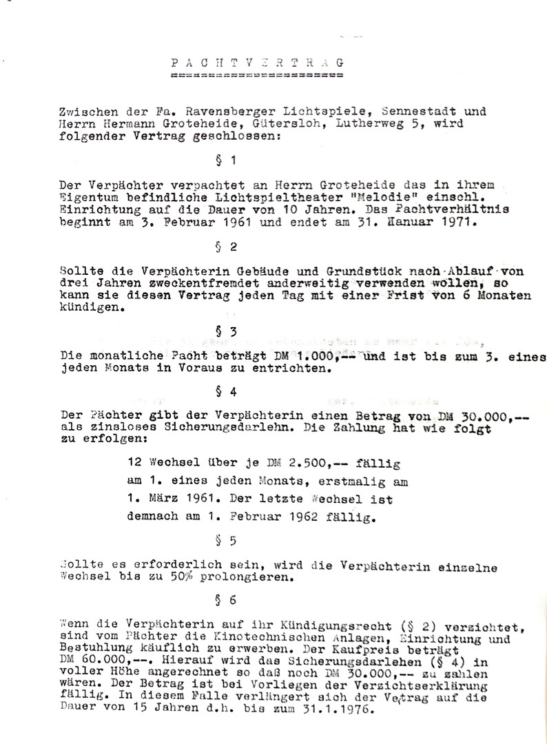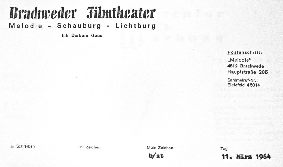 Unter dem für ein Kino nicht eben alltäglichen Namen "Melodie" wird heute (15. Oktober 1954) als Nachfolger der alten "Schauburg" ein neues Lichtspielhaus eröffnet. Der wuchtige Bau gibt dem Platz an der Einmündung der Hauptstraße in die Gütersloher Straße ein markantes Gepräge. In der erstaunlich kurzen Bauzeit von rund einem Vierteljahr erstand er unter der Leitung des Architekten, Diplom-Ingenieur Ernst-Otto Roßbach, der auch das im Vorjahr eingeweihte "Zentral-Theater" schuf.